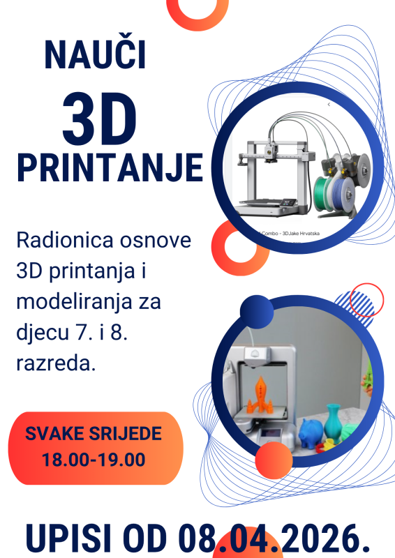 Od srijede 08.04.2026. 18h Klub tehnike provodi upise u besplatne radionice 3D printanja i modeliranja za djecu 7. i 8. razreda. Radionice će se održavati svake srijede od 18:00 do 19:00 sati u prostorijama Kluba tehnike, Trg Svetog Trojstva 9.
